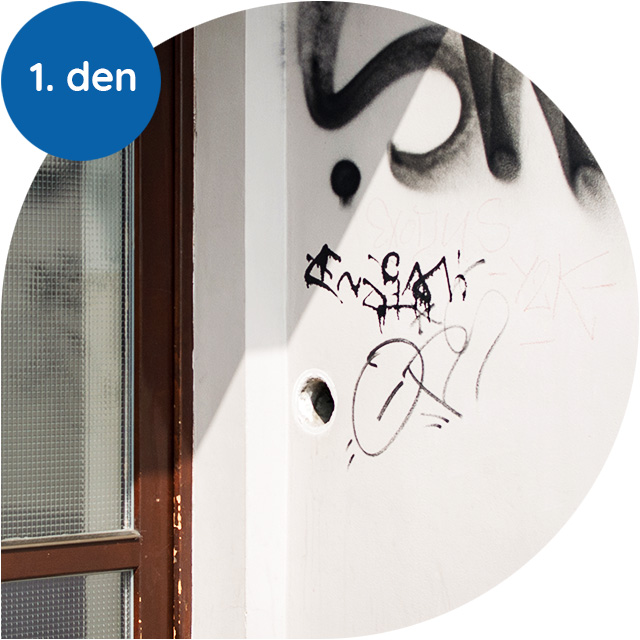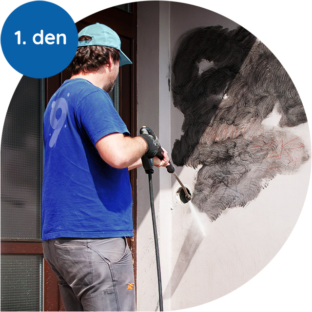 Pro profesionální a šetrné odstranění graffiti se nám osvědčil dvoufázový postup — první den graffiti odstraníme, necháme vyschnout a druhý den povrch obnovíme do původního stavu.