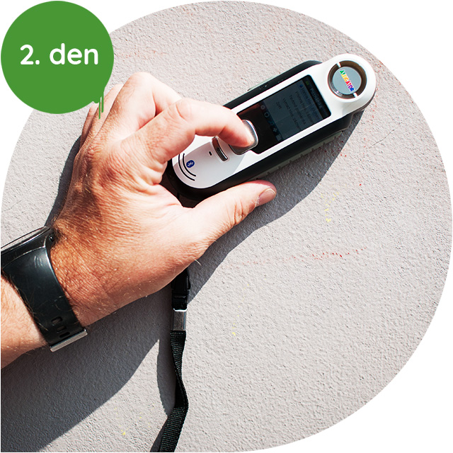 Druhý den naměříme přesnou barevnost odstínu naším spektrometrem, díky kterému můžeme připravit správný odstín originálního podkladu.